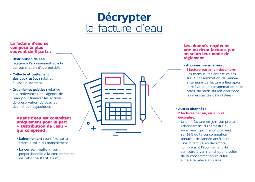 une part "distribution de l'eau", comprenant une part fixe (abonnement eau potable, payable par semestre et par avance) et une part variable proportionnelle à la consommation. Celle-ci est facturée sur la base de l’index relevé à votre compteur ou d’une estimation. Cette part est intégralement reversée à atlantic’eau afin de financer les frais de fonctionnement et d’investissement du service de l’eau (captage, traitement, stockage, contrôle et distribution).
