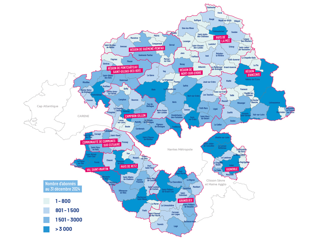 Atlantic’eau est le service public en charge de l’eau potable sur 148 communes : 145 en Loire-Atlantique, 2 en Vendée et 1 en Maine-et-Loire. 250 000 abonnés sont raccordés au service.